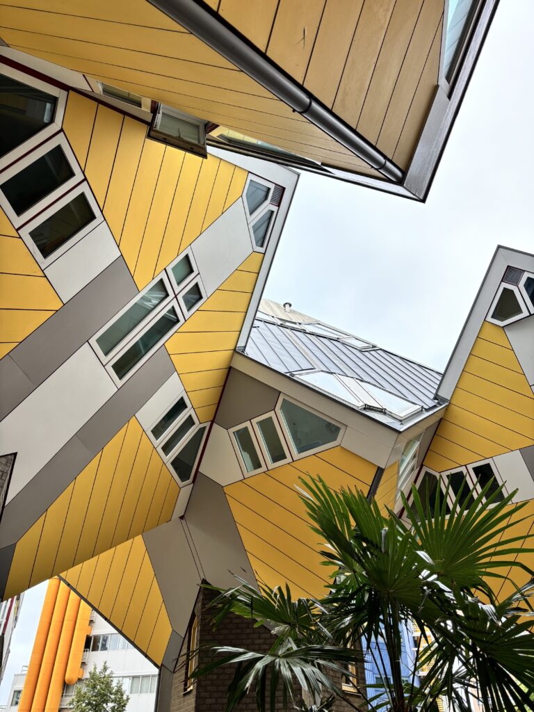 De Kubuswoningen – opvallende gele blokken in de vorm van gekantelde kubussen.